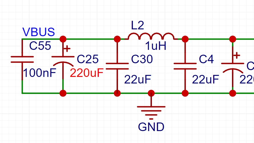 先是在输出电路中串接了一个电感,电容就是还是用的之前焊在板子上的电容。大致原理图为这样: